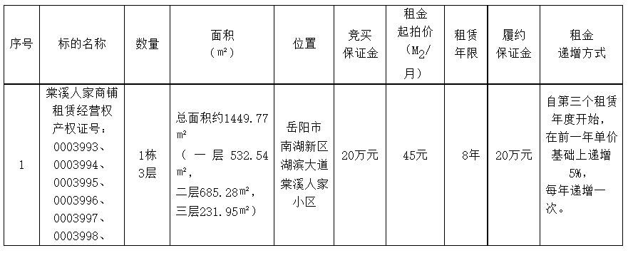 受委托,我公司于2021年10月25日上午10時(shí)以網(wǎng)絡(luò )競價(jià)的方式對位于岳陽(yáng)市南湖新區湖濱大道棠溪人家小區臨街的部分商鋪(原棠溪人家售樓部)的租賃經(jīng)營(yíng)權進(jìn)行公開(kāi)拍賣(mài)。